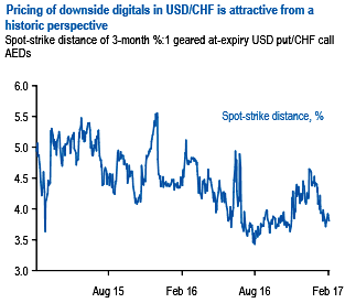 2) Digitals are reasonably priced for downside in USDCHF. The digital profile can be replicated with a vanilla spread (refer above chart).