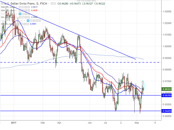 - USD/CHF has shown a minor decline from the high of 0.97050 made yesterday. The pair hits intraday low of 0.96127 and jumped slightly from that level. It has broken yesterday high of 0.96605 and is currently trading around 0.96307.