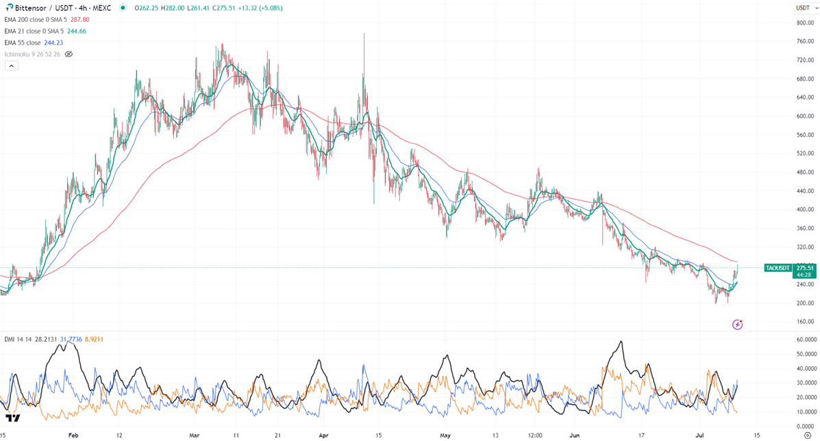 TAOUSD surged more than 35% in the past three days. It holds above the short-term (21 and 55 EMA) and above the long-term moving average. It hit a high of $276 and is currently trading around $270.