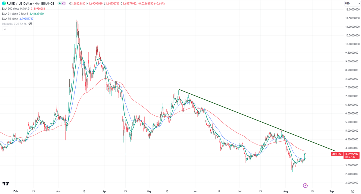 RUNEUSD has gained more than 45% in the past ten days. The pair holds above the short-term (21 and 55 EMA) and below the long-term moving average in the 4-hour chart. It hit a high of $3.72 and is currently trading around $3.66.