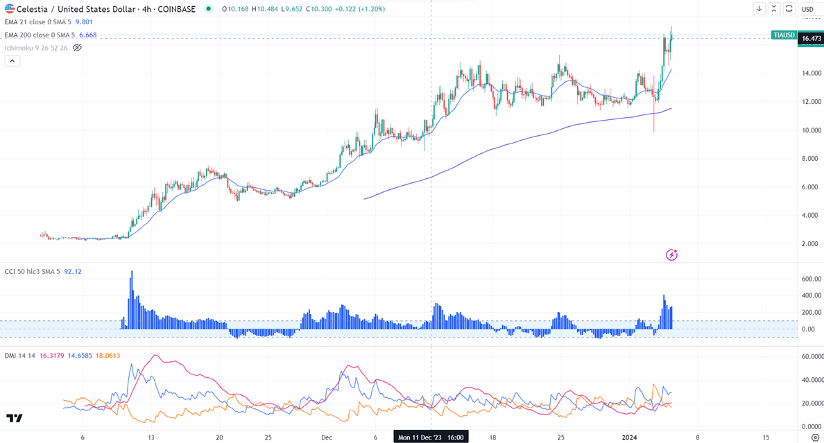 TIAUSD gained more than 22% in the past 24 hours with record volume at nearly $800 million. The demand for TIA tokens increased due to staking rewards. The native platforms yield between 15 to 17%. The pair holds well above the short-term (21 and 55 EMA) and long-term moving average. It hit a high of $17.29 and is currently trading around $16.50.