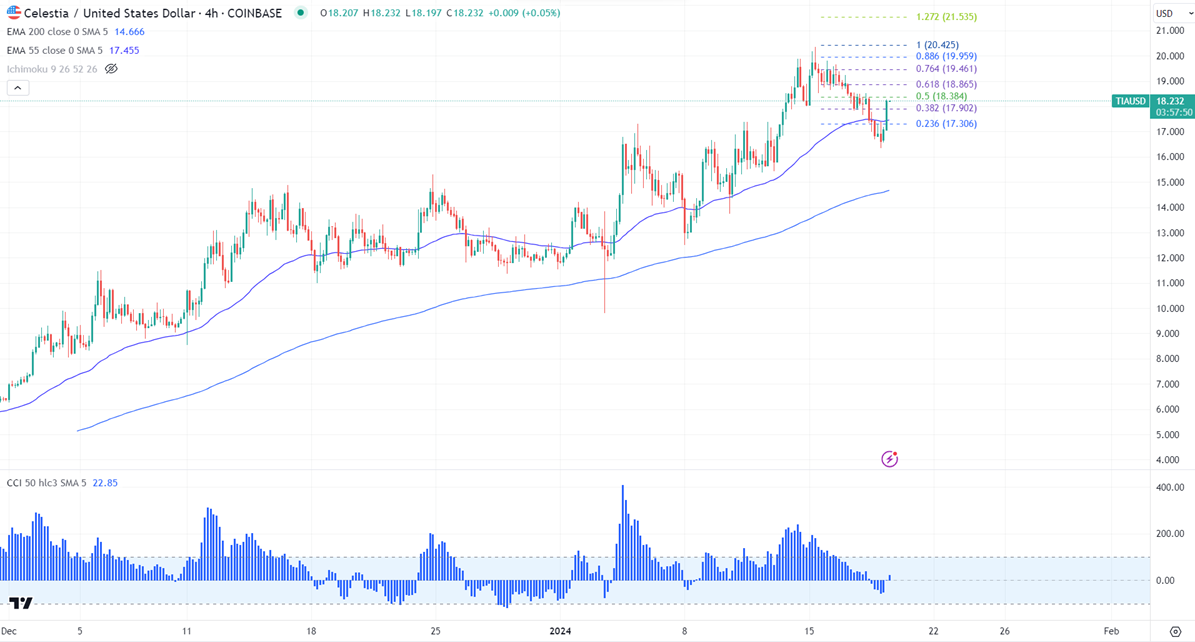 TIAUSD showed a minor pullback after a 20% sell-off. The pair holds well above the short-term (21 and 55 EMA) and long-term moving average. It hit a high of $20.35 and is currently trading around $18.18.
