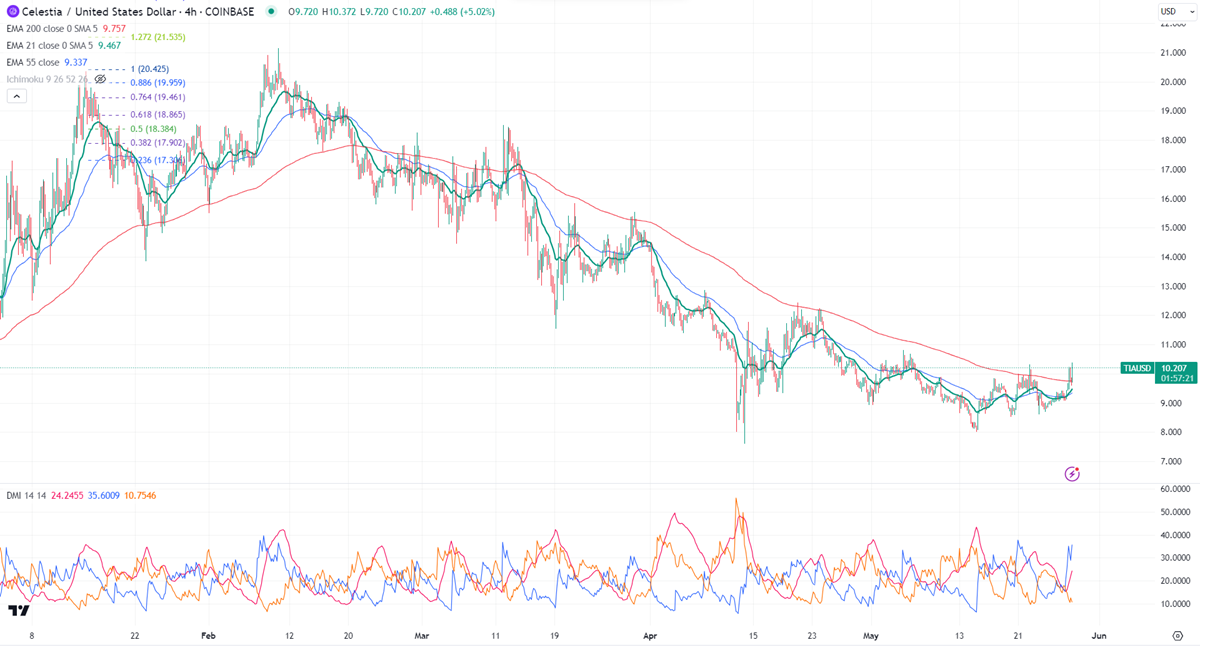 TIAUSD gained more than 20% in the past four days. The pair holds well above the short-term (21 and 55 EMA) and long-term moving average. It hit a high of $10.37 and is currently trading around $10.24.