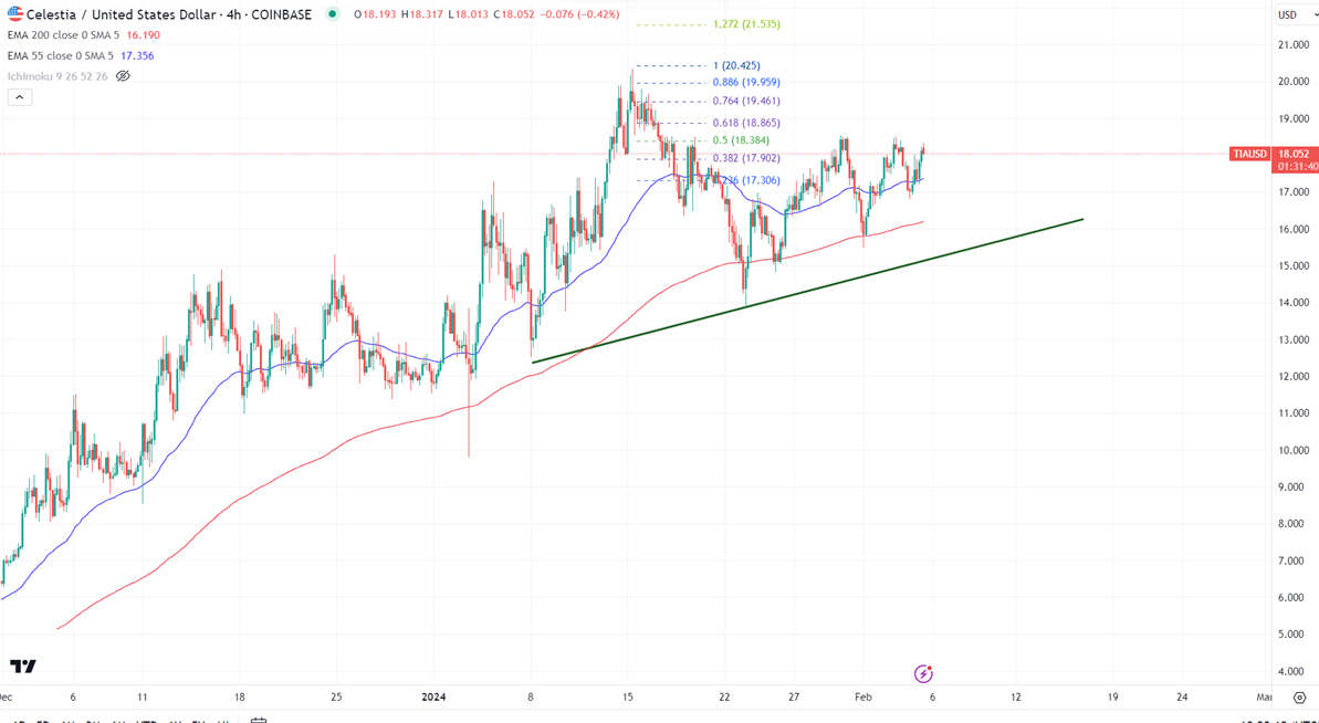 TIAUSD gained more than 8% in the past two days. The pair holds well above the short-term (21 and 55 EMA) and long-term moving average. It hit a high of $18.25 and is currently trading around $18.19