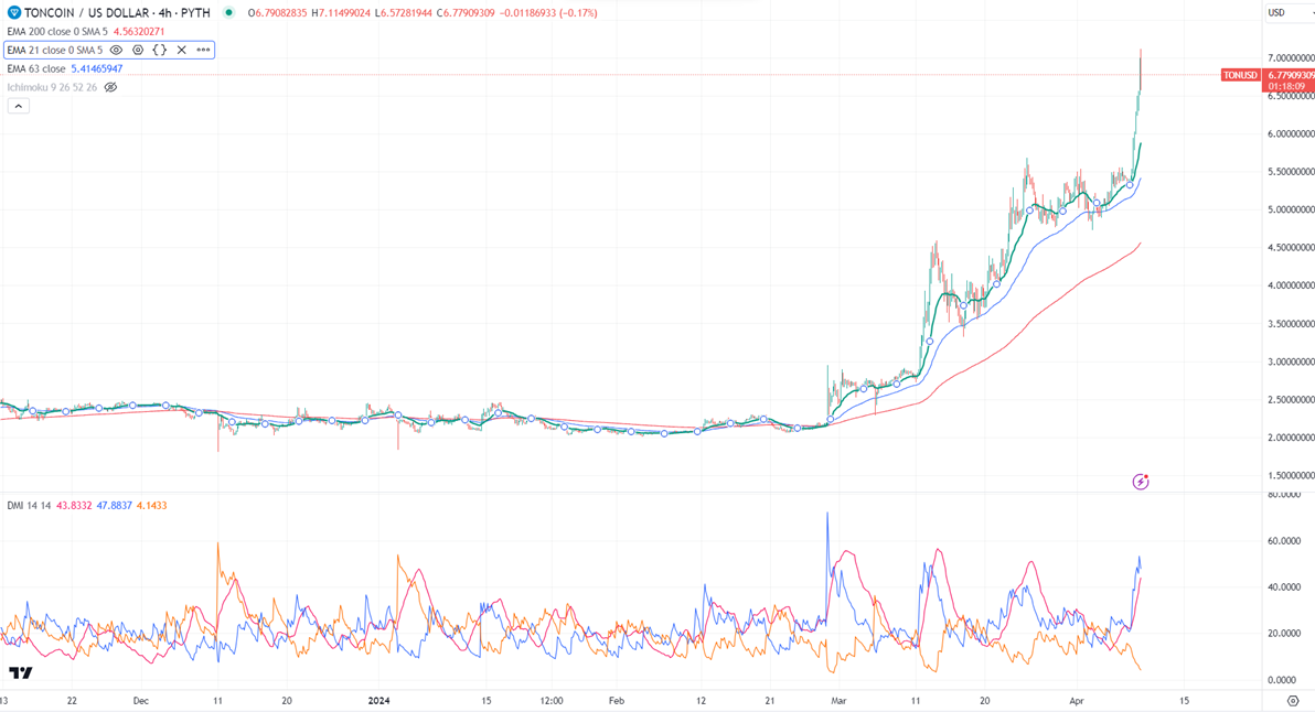 TONUSD surged more than 50% in this month. The pair holds above the short-term (21 and 55 EMA) and long-term moving average in the 4-hour chart. It hit a high of $7.11 yesterday and is currently trading around $5.17.