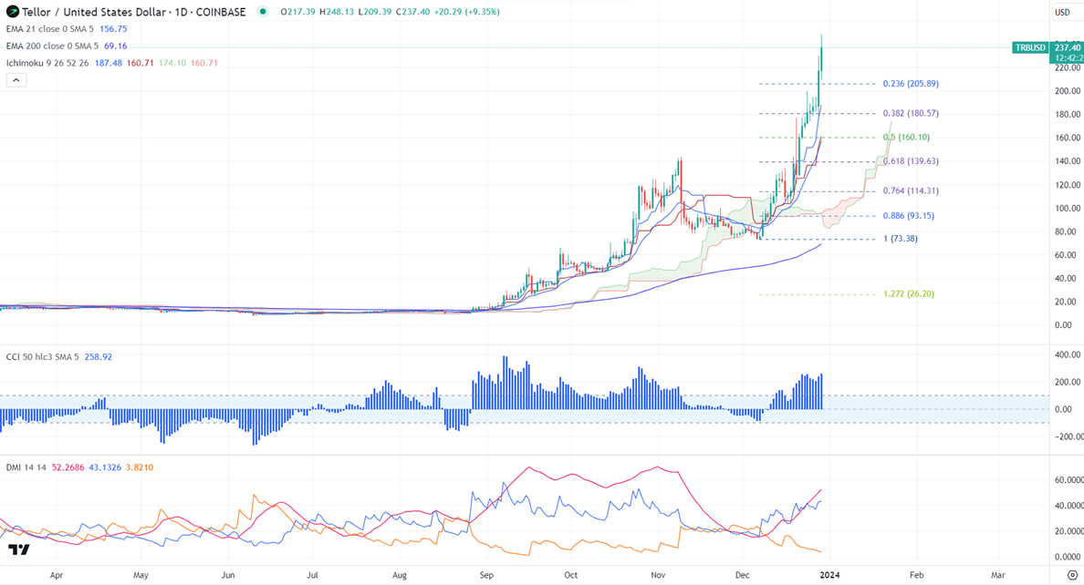AAVEUSD was the best performer this month and surged nearly 250% from the low of $73.29. The pair holds well above the short-term (21 and 55 EMA) and long-term moving average. It hit a high of $248 and is currently trading around $235.71.