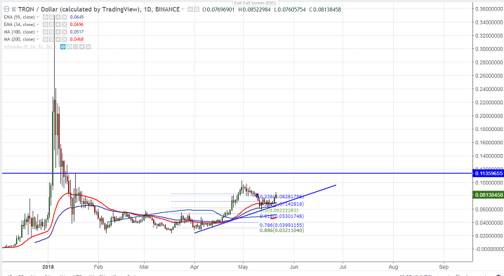 - Tron is continuing its bullishness for past 4 trading days and jumped almost more than 40%. It has surpass IOTA in market cap and reached the 9th spot. Overall the pair jumped almost 350% from the low of 0.02280. Justin Sun in a recent Huobi conference in Korea mentioned about “secret announcement” he will make in June post Main Net launch. It is expected that once Tron is launches own Main Net , the plat form will see an increase in the number of developers launching Dapp. The launch date of main net advanced from Jul 1st to May 31st .In anticipation of the launch market expects TRON price to move upward till May 31st 2018.The Main net launch has seen lot of supporters joining TRON, including 8 large crypto exchanges.