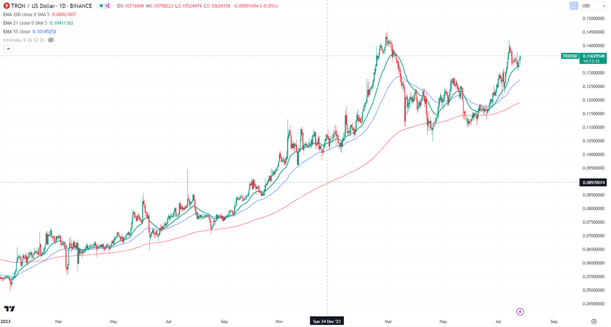 TRXUSD is consolidating after a jump of more than 30%. The pair holds above the short-term (21 and 55 EMA) and long-term moving average in the 4-hour chart. It hit a high of $0.1420 and is currently trading around $0.13630.