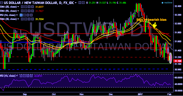 We prefer to take short position in USD/TWD around 31.20, stop loss 31.35 and target of 30.70.