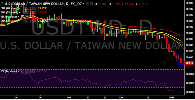 We prefer to take short position in USD/TWD around 29.55, stop loss at 29.72 and target of 29.28.