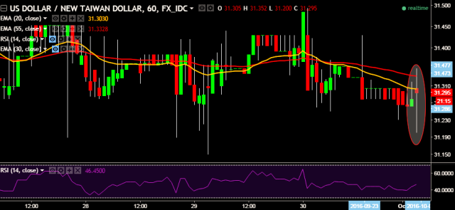 We prefer to go short on USD/TWD only below 31.20 with stop loss at 31.45 and target of 30.99.