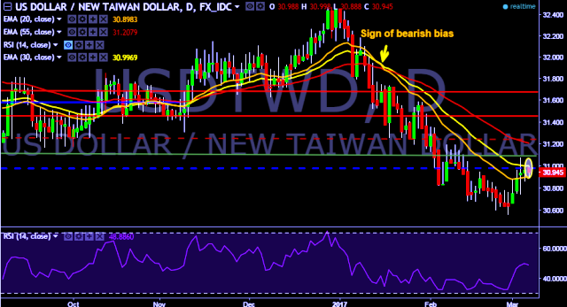 We prefer to go short on USD/TWD around 30.96 with stop loss at 31.07 and target of 30.74.