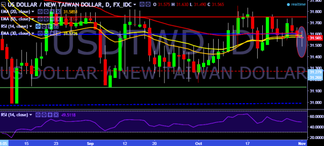 We prefer to go short on USD/TWD around 31.60, stop loss 31.74 and target of 31.38.