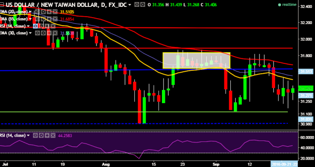 We prefer to go short on USD/TWD around 31.45 with stop loss at 31.62 and target of 31.16/30.99.