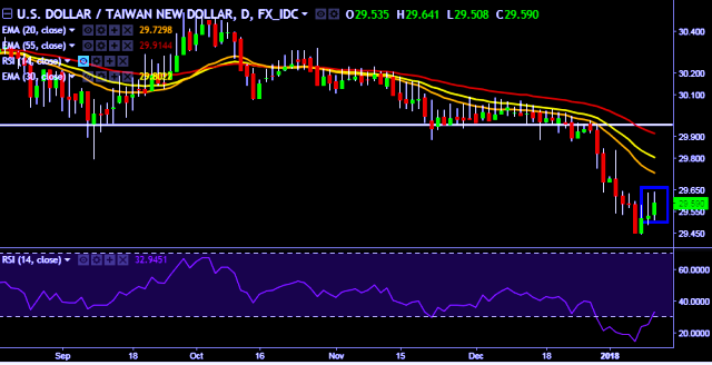We prefer to take long position in USD/TWD around 29.55, stop loss at 29.42 and target of 29.90.