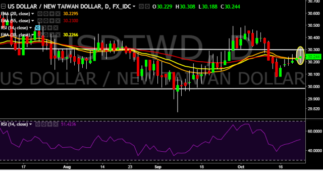 We prefer to take long position in USD/TWD around 30.25, stop loss at 30.10 and target of 30.50 mark.