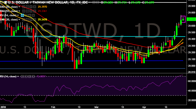 We prefer to take long position on USD/TWD around 29.70, stop loss 29.56 and target of 30.02.
