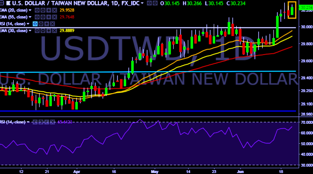 We prefer to take long position on USD/TWD around 30.22, stop loss at 30.10 and target of 30.39.