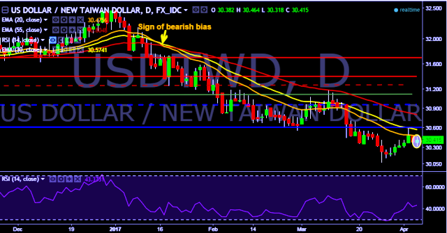 We prefer to take long position in USD/TWD only above 30.48, stop loss 30.30 and target of 30.72/30.97.