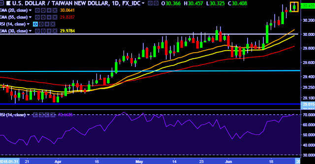 We prefer to take long position on USD/TWD around 30.38, stop loss at 30.22 and target of 30.90.