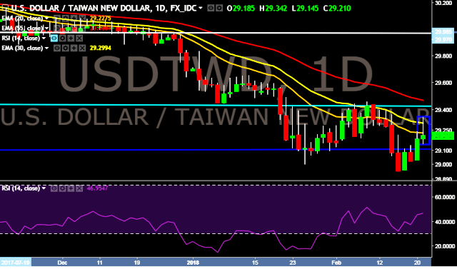 We prefer to take short position in USD/TWD only below 29.08, stop loss at 29.40 and target of 28.49.