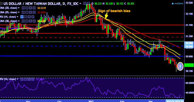 We prefer to take long position in USD/TWD around 30.25, stop loss 30.06 and target of 30.57.
