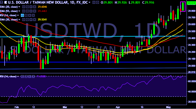 We prefer to take long position on USD/TWD around 29.87, stop loss 29.67 and target of 30.02/30.22.