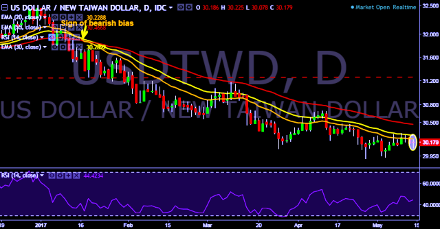 We prefer to take short position in USD/TWD around 30.20, stop loss at 30.26 and target of 30.01.