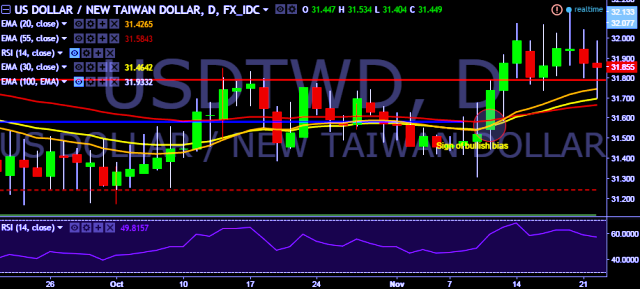 We prefer to go long on USD/TWD around 31.70, stop loss 31.50 and target of 31.99/32.08/32.18/32.43.