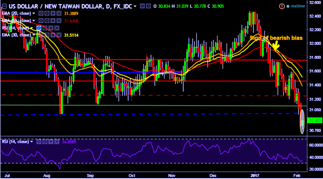 We prefer to take short position in USD/TWD around 30.95, stop loss 31.15 and target of 30.77/30.68.