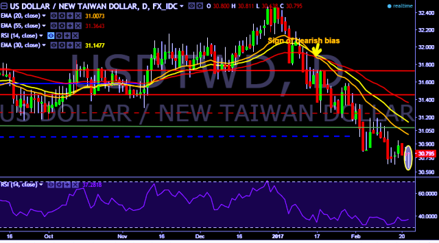 We prefer to go short on USD/TWD around 30.78 with stop loss at 31.00 and target of 30.63/30.45/30.39.