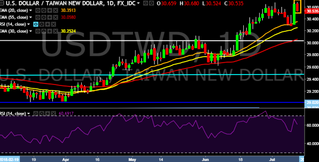 We prefer to take short position on USD/TWD around 30.57, stop loss at 30.68 and target of 30.42/30.30.