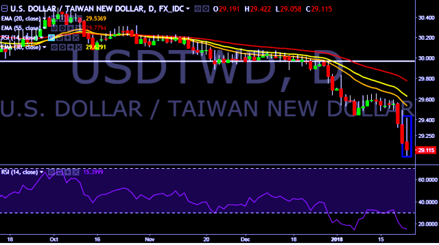 We prefer to take short position in USD/TWD around 29.22, stop loss at 29.50 and target of 28.77.