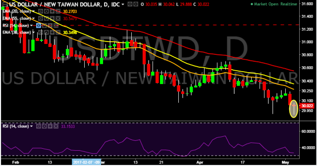 We prefer to take short position in USD/TWD around 30.05, stop loss at 30.23 and target of 29.85/29.61.