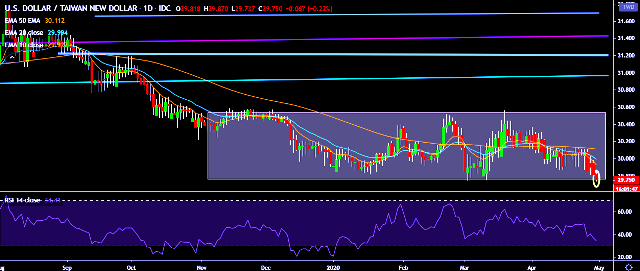 - USD/TWD is currently trading around 29.75 marks.