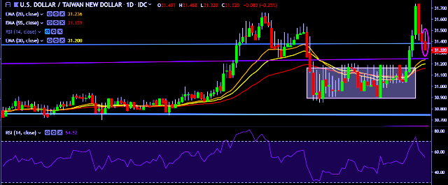We prefer to take long position on USD/TWD around 31.30, stop loss at 31.12 and target of 31.70/31.90.