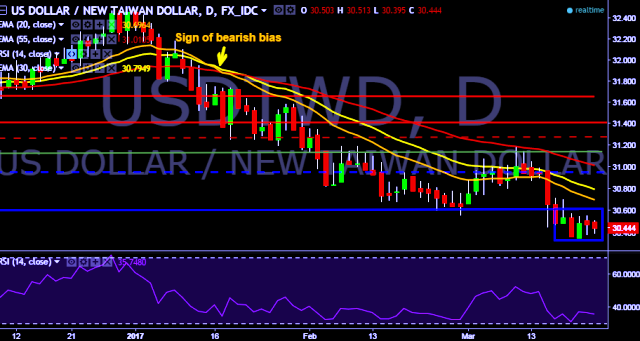 We prefer to take long position in USD/TWD only above 30.57, stop loss at 30.35 and target of 30.97.