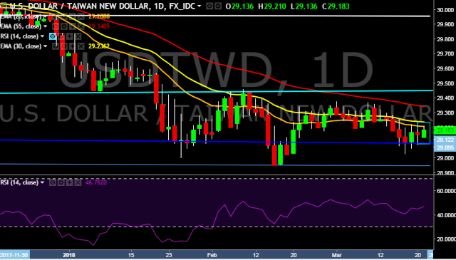 We prefer to take long position in USD/TWD around 29.15, stop loss 29.02 and target of 29.50.