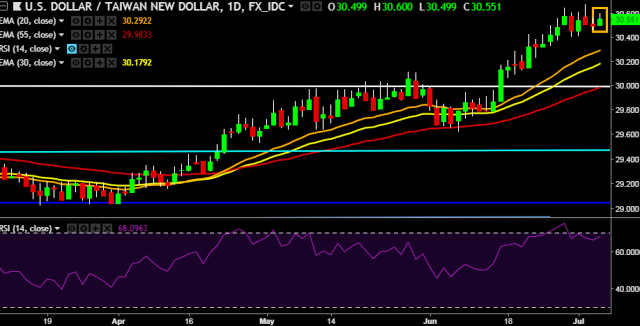 We prefer to take long position on USD/TWD only above 30.64, stop loss at 30.50 and target of 30.90.