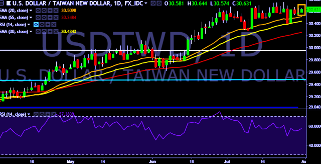 We prefer to take long position on USD/TWD around 30.60, stop loss at 30.40 and target of 30.75/30.90.