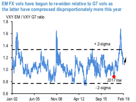 An odd by-product of the nosedive in G7 vol has emerged: EM vs. G7 vol spreads are re-widening, not because risk premia in EM are rising as was the case last year – quite the opposite in fact – but because G7 options have cheapened disproportionately more (refer 1st chart).