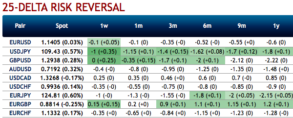 The rationale: 1M ATM IVs are trading between 6.30% - 6.75%, skews are also suggesting the odds on OTM call strikes up to 1.35 levels at this juncture. Please notice bullish neutral risk reversals that signal upside risks in the risk-neutral distribution of returns. Also, the IV curve is at, or slightly decreasing, with maturity.