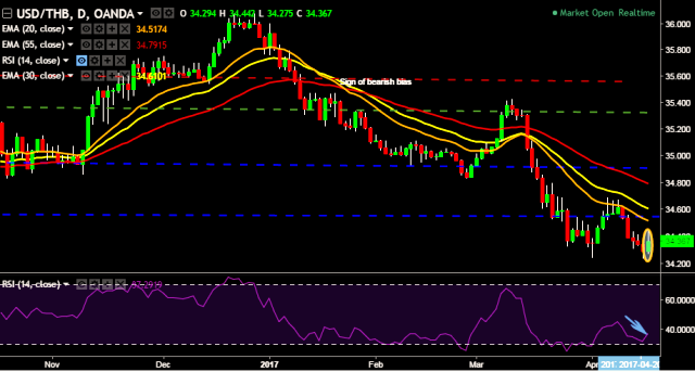 We prefer to take long position in USD/THB around 34.35, stop loss at 34.24 and target of 34.56.