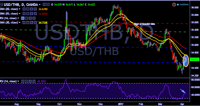 We prefer to take short position in USD/THB only below 34.57, stop loss at 34.69 and target of 34.35.