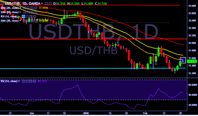 We prefer to take long position in USD/THB only above 31.55, stop loss at 31.35 and target of 31.92.