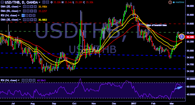 We prefer to take short position in USD/THB only below 35.25, stop loss at 35.42 and target of 35.10/34.99.