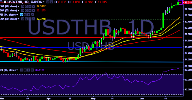 We prefer to take long position in USD/THB around 32.95, stop loss at 32.87 and target of 33.24.