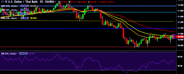 We prefer to take long position on USD/THB only above 30.97, stop loss at 30.80 and target of 31.20.