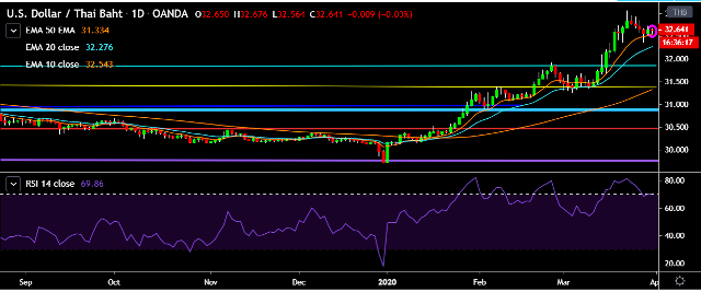 We prefer to go long on USD/THB only above 32.72, stop loss at 32.50 and target of 32.94.
