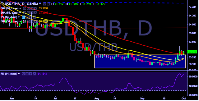 We prefer to take long position on USD/THB only above 33.40, stop loss at 33.29 and target of 33.77 mark.